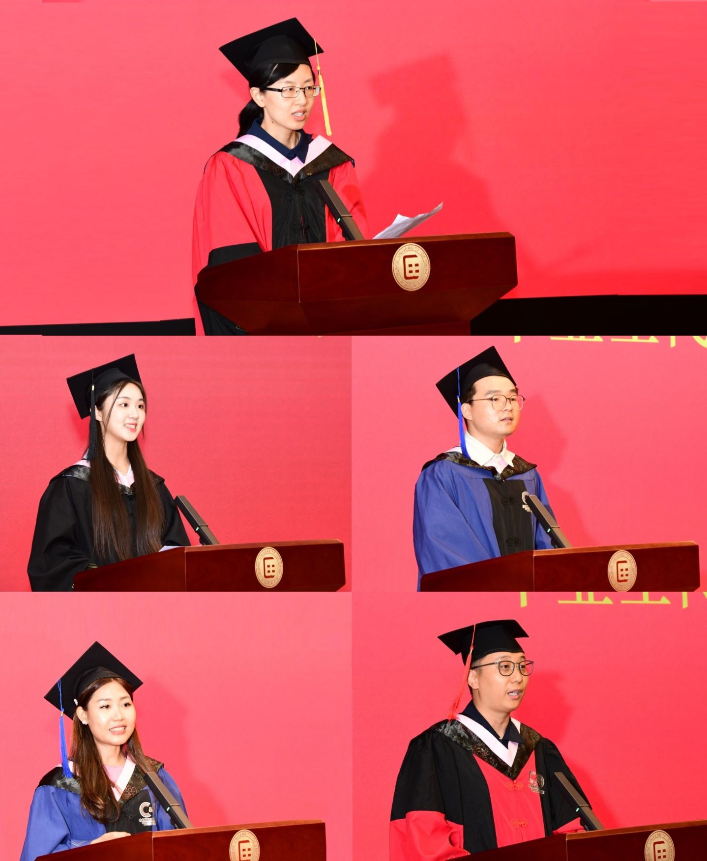 2021级本科毕业生代表朱芳慧以诗意的语言见证了新校区的变迁,回顾了在丰台校区的学习生活,将青春记忆喻为“一本难懂又热烈的书”,并发出“过尽千帆初心不改”的邀请。硕士毕业生代表王博威以幽默自省的口吻,将毕业前的紧张备考比作“偿还英国的松弛”和完成“NPC任务”,深情回忆课堂互动与同窗情谊,呼吁大家带着“各美其美,美美与共,知行合一”的民大精神勇敢前行。缅甸籍硕士毕业生岳美玲的分享尤为动人。她回顾了疫情期间的孤独、家乡政变的震撼、手术时师友的温暖,以及家乡地震后民大师生给予的关怀。她表示“幸福藏在平凡日常中”,要珍视校园生活的点滴,永远“做自己”。博士生代表祝鹏讲述了自己从新疆莎车县扶贫一线跨越“三千公里教育鸿沟”来黑丝a片