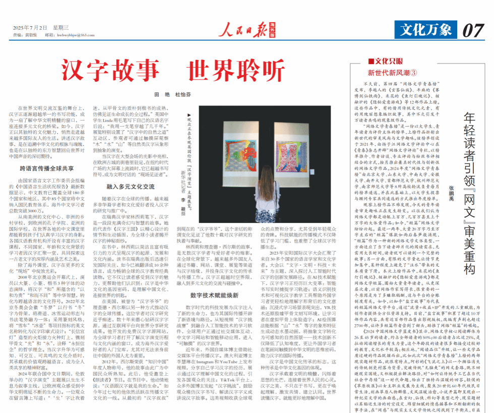 田艳老师和2022级硕士研究生杜怡芬同学撰写的《汉字故事,世界聆听》一文,该文被光明网等媒体转载。全文如下: