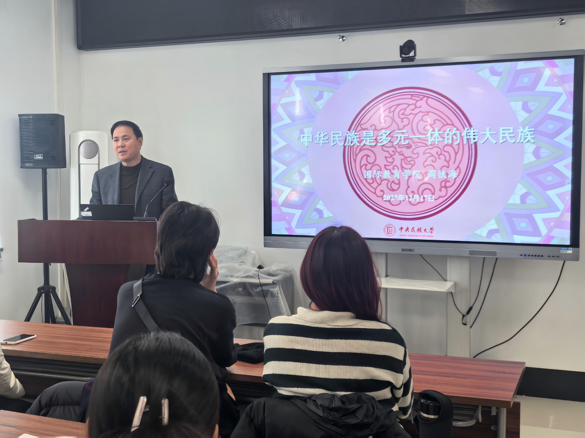党委书记周铁海为来自20多个国家的60多名本科生、研究生和语言进修生新生作题为“中华民族是多元一体的伟大民族”的中国国情教育讲座。讲座在学院报告厅举行,现场气氛热烈。