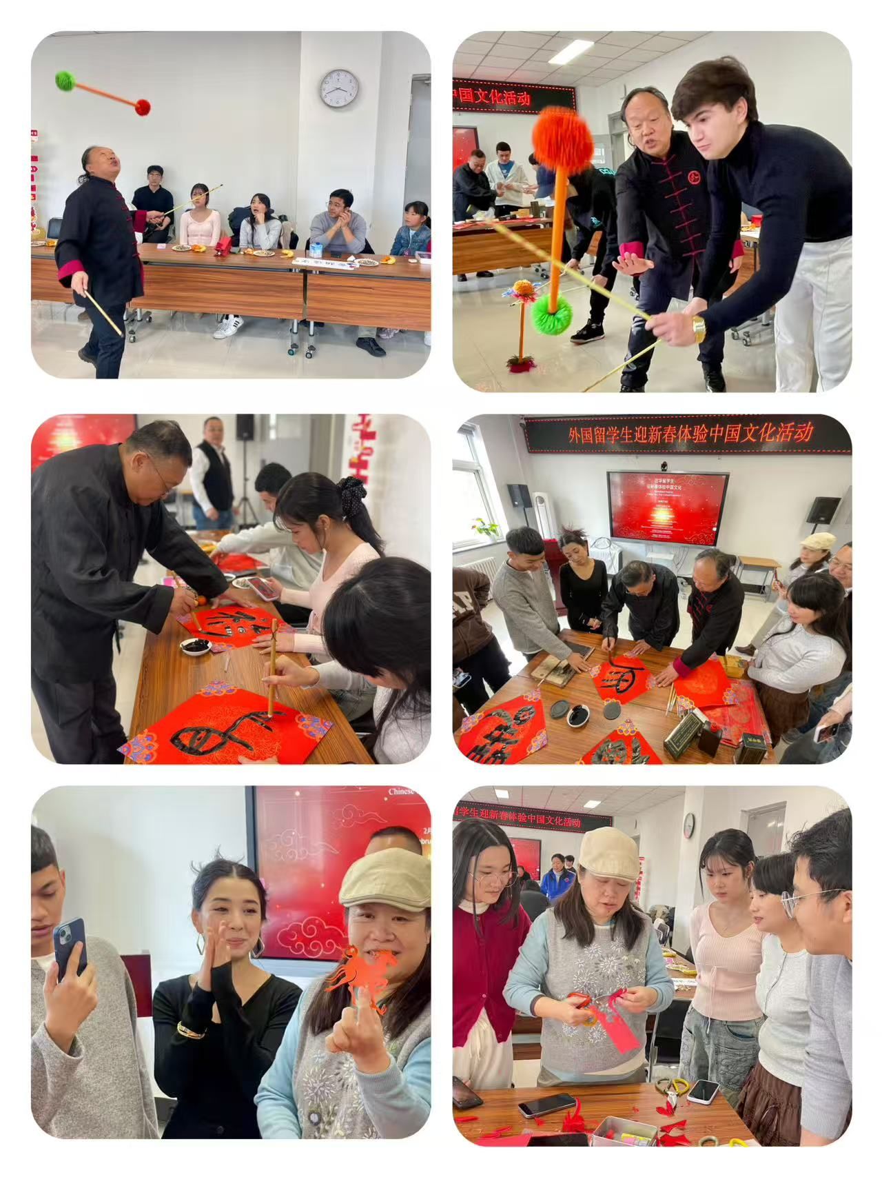 本次活动以“迎新春体验中国文化”为主题,旨在通过生动有趣的文化体验,增进国际学生对中国传统节日与民俗的理解,促进中外文明交流与友谊。活动邀请了书法、剪纸、打花棍等领域的非遗传承人与专业教师现场教学,让国际学生在亲手实践中领略中华文化的独特魅力。