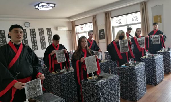 10月28日上午,中亚班学生去参观了曲阜孔子文化学院,在孔子文化学院里还专门学习了拓片,与此同时,大家还穿上了汉服,学习和体验中国古代礼仪,进一步感受汉文化的魅力。