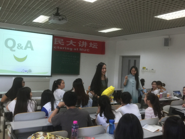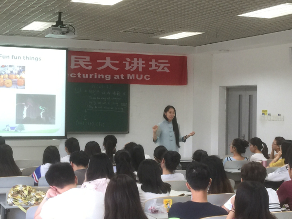 的合作项目赴美国西东大学攻读学位,曾先后在美国的大学和中小学任教,现任职于新泽西州的中小学,从事汉语教学和中国文化传播工作。在经验交流会开始之前,蓝青青老师用一个可爱的海绵宝宝与同学们进行了轻松的互动,示范了她在美国课堂上教汉语的技巧。随后,蓝青青从多个角度与新生们分享了她在民大和海外的求学经历、生活,以及在美国的工作经历,并对新生们提出了中肯的建议和热切的期望。最后,蓝青青一一回答了同学们的提问,为他们解疑释惑。通过此次经验交流会,同学们对今后的学习和工作安排都有了更加深入的了解。