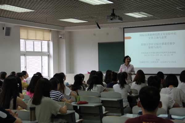 梁霞教授在讲解美国大学中文综合课课堂教学原则与技巧时,谈到了四个方面。首先,汉语教师在教学实践中要认识到不同文化、社会之间只有不同,没有对错。其次,在教学过程中,教师要注意与学生的交流与互动,不要认为只有自己讲课才算是课堂教学。第三,跨文化交际无法回避敏感、有争议的话题,这些话题并不是禁区,如果处理得当往往是课堂教学最活跃的地方。最后,梁霞教授指出课前的集体备课和同事之间的讨论很有必要。