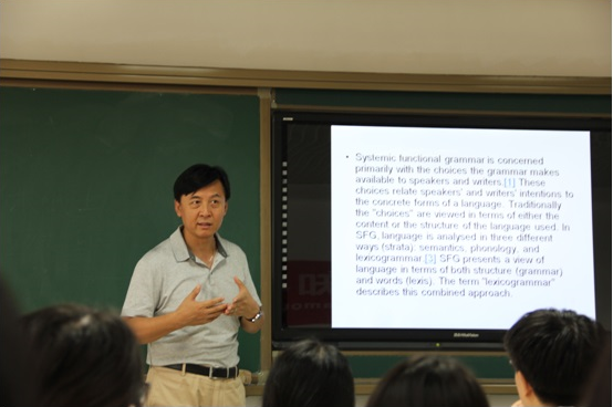 在主题为汉英对比语法与汉语作为第二语言教学的讲座中。刘教授向同学们详细介绍了汉语定值的概念及其衍生的各类语法问题,不仅加深了同学们对汉语定值范畴语法化诸多问题的认识,拓宽了汉语语法知识结构,也为今后的教学提供了更有意义的指导。刘老师对中英文词语的翻译进行了比较,指出了在翻译过程中经常出现的错误,列举了很多例子来证明得体翻译的重要性。而后又对教学法流派进行了分析与对比,指出乔姆斯基的教学法主张脱离语境式的学习,而韩礼得提出的情景教学法主张学习者应当使用上下文结合的方式。通过分析常见的使用偏误的例子“了”指出了词汇翻译与运用应当准确,也给我们一个启发:在对外教学过程中对词汇教与用应当恰当和准确。刘教授指出了教学法的两个共识:对外汉语教学是语义为主导或情景为主导的教学。