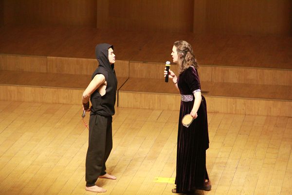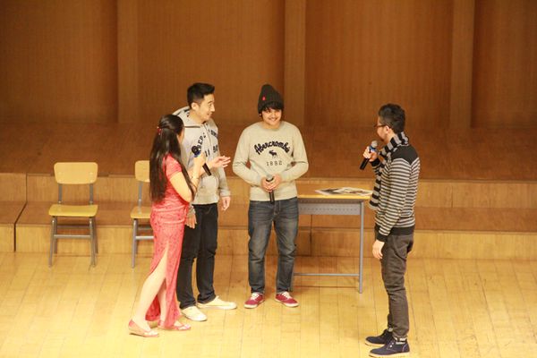 第八个节目是由语言六班奉献的话剧《比艺招亲》,“年轻貌美”的富家小姐要通过比试才艺选择良婿,两位公子前来应征,比试才艺,最后小姐选择了汉语更好的何公子。