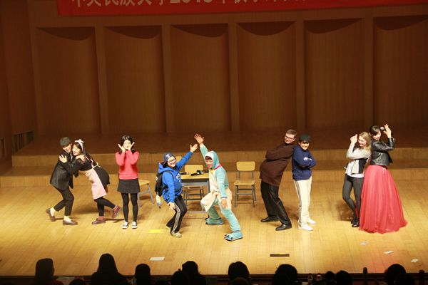 第二个节目是由本科一年级一班奉献的话剧《扑克背后的秘密》,先由扑克魔术引入,而后同学们通过比大小的方式介绍和解释了中国文化,最后大家齐唱起《爱我民大》。