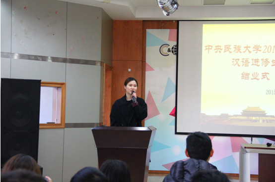 语言生4班班主任冯凌宇老师、对外汉语系副主任邓秀均老师作为教师代表发言。邓秀均老师在发言时提到曾在北京留学学习汉语的哈萨克斯坦总理马西莫夫,她希望所有学生向最近来华参加第二届世界互联网大会的马西莫夫总理学习,希望同学们今后能成为像马西莫夫一样优秀的人。邓老师对参加结业式的所有留学生说道:你们都是中国和你们国家之间“友谊的种子”、“未来的使者”。