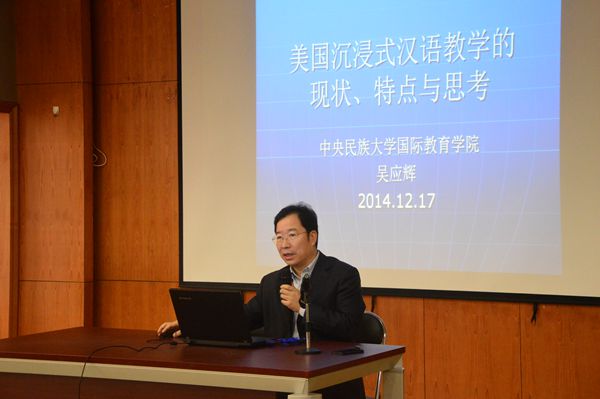 吴应辉教授第一个做报告。他就本次讲座的基本情况向大家做了简短的介绍,紧接着为大家带来了《美国沉浸式汉语教学的现状、特点与思考》的报告。报告中,吴院长为大家分析了美国现在的沉浸式汉语教学的基本情况,其中包括美国沉浸式汉语教学的分类、起源、发展情况以及分布情况,同时他还提出了自己对于沉浸式教育的一些思考,在他看来,沉浸式教育已经成为青少年学习第二语言最好的教学模式。