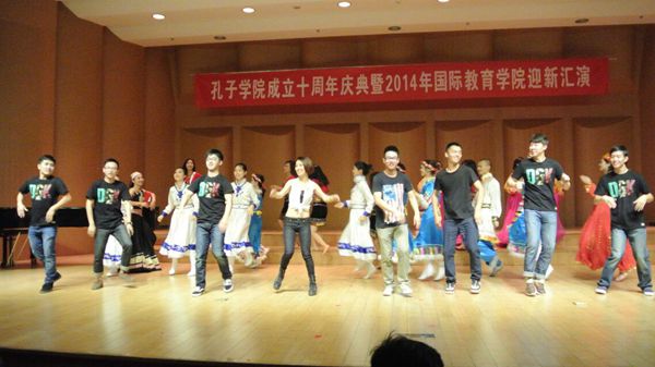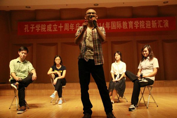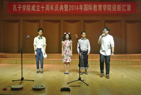 孔子学院奖学金生也登上了舞台,为我们带来了幽默风趣的“三句半”,表达了他们对民大的感谢以及对学习汉语地浓厚兴趣。之后,田艳老师和陈作宏老师协两位13级硕士生为我们带来了精彩的配乐诗朗诵“透过历史的眼眸”, 热情洋溢和深情真挚地朗诵感动了在座的每一位老师、同学,为晚会的圆满举办增添了浓墨重彩的一笔。