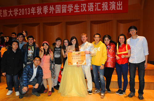 在一年中取得的骄人成绩和学院的新发展:研究生大合唱勇折桂冠,荣获全校第一名;学院教师在知名刊物上发表20多篇学术论文和10本研究生教材。最后,由马文喜副校长和吴应辉院长分别为获奖节目颁奖,2013秋季外国留学生汉语汇报演出就此圆满落幕。