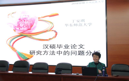 讲座主题为汉硕毕业论文中的问题分析。讲座过程中,丁安琪教授就汉硕毕业论文研究方法中的问题进行深入分析,内容主要包括汉硕论文中研究方法的三个层级、常见的研究方法类问题以及常出现的几个问题方法,并通过案例分析与在座的师生进行交流和探讨。在本次讲座中,丁安琪教授指出了大量研究博硕士论文研究方法认识的误区,与在座的师生针对汉硕培养方向、汉硕论文研究方法等学术问题做了很多深入的探讨和交流。最后她鼓励大家在进行研究的过程中要研究方法和研究意识相结合。讲座学术讨论气氛热烈,同学们也在会后积极地与丁安琪教授展开了进一步的学术探讨。