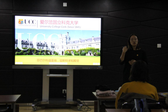 此次宣讲从爱尔兰知识小测试开始,由语言课程教师肖恩向同学们提问,并向回答正确的同学赠送小礼品,调动了现场同学的积极性,气氛十分活跃。付老师通过图片、实例和视频向同学们介绍了爱尔兰的地理环境和风土人情,使同学们对爱尔兰有了更加全面的了解。随后,付老师向同学们介绍了爱尔兰国立科克大学的学部设置、课程设置和社团活动,并展示了优美的校园风光。