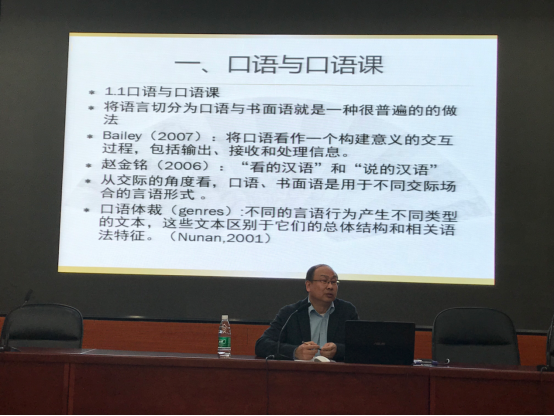 潘教授此次讲座的主题为“任务引领的中高级口语教学新模式”。首先,潘先军教授讲解了口语的主要现象为冗余成分、自我更正、重复、解释性成分、估测性成分以及提示性成分,指出口语是根据交际情景的需要准确得体表达出的“说的汉语”。接着潘教授详细讲述了各阶段口语课教学的训练方式和重点,如初级阶段多是机械训练,而中高级阶段则侧重自由交际训练。最后潘教授对口语教学的现状与不足进行详细分析,提出基于任务的中高级口语教学模式,强调任务引领,团队合作,在实践中提升口语水平。