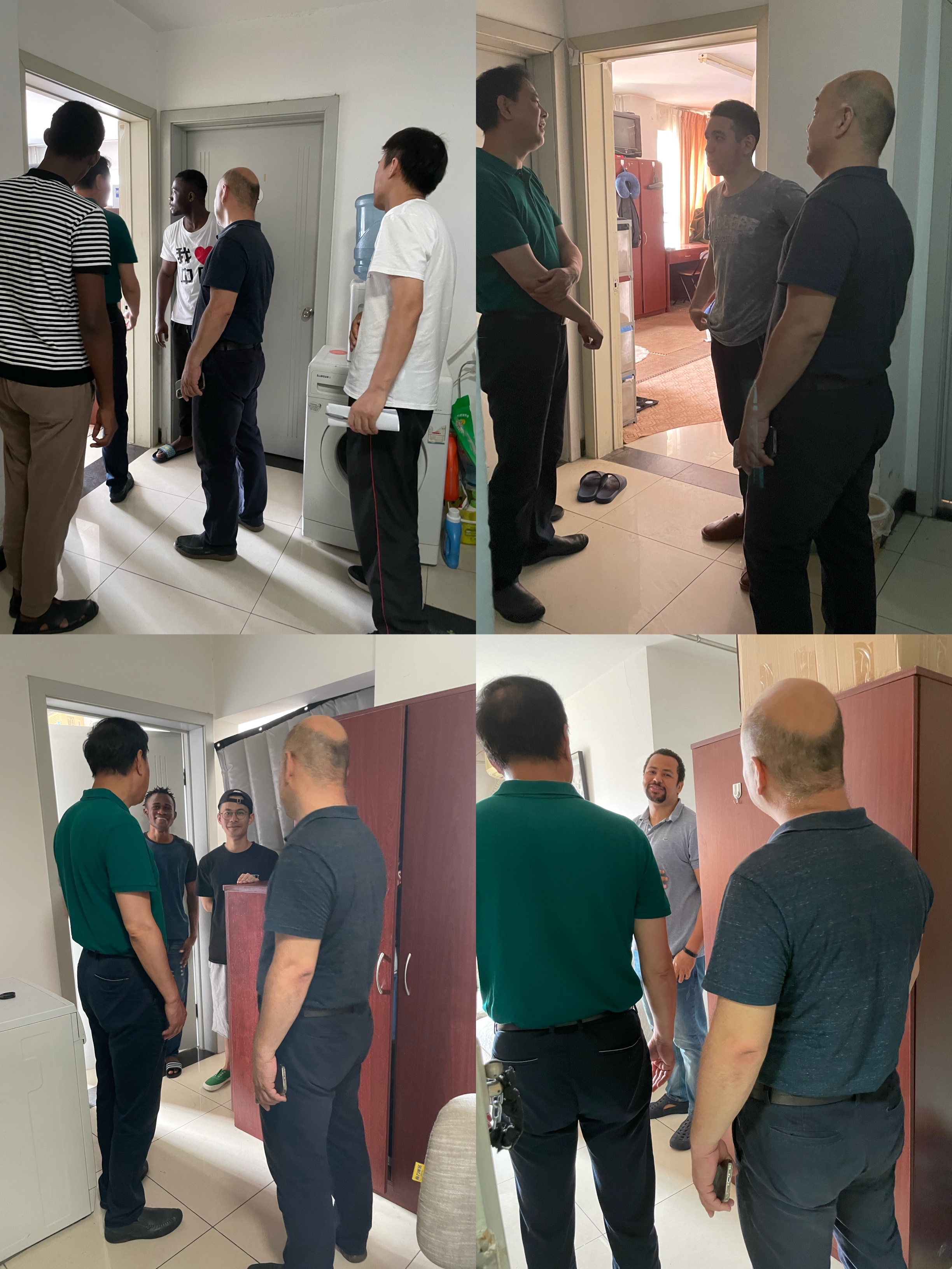 在西门国际学生公寓,学院领导挨个走访每名在校国际学生宿舍,询问学生近期学习、生活情况,了解毕业生今后打算,排查宿舍安全隐患。