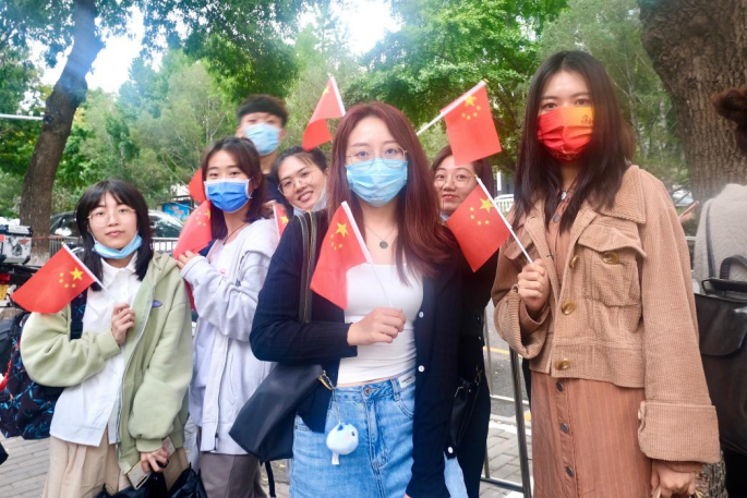 2021年10月1日,月华皎皎,夜风微凉,凌晨四点半,华灯倒映下的长安街已经十分热闹,来自四面八方的群众陆续来到天安门广场周边。有的戴着“中国红”口罩,有的手持小国旗,还有的在脸上印着国旗的图案。大家都自觉排队等候,安检入场,一切井然有序。为给祖国庆生,刚入学不久的百余名黑丝a片