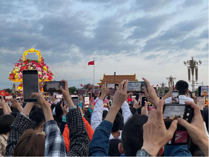 天刚蒙蒙亮,天安门广场已经被密集的人群包围,在这为祖国庆生的日子,每个人的脸上都洋溢着兴奋和期待。随着天安门城楼上军乐队奏出雄壮的音乐,国旗护卫队传来铿锵有力、整齐划一的脚步声,人声鼎沸的现场顿时肃静下来。寂静中,蕴藏着磅礴的力量—十多万人汇聚的天安门广场,静得似乎连每个人自己的呼吸声都清晰可闻。