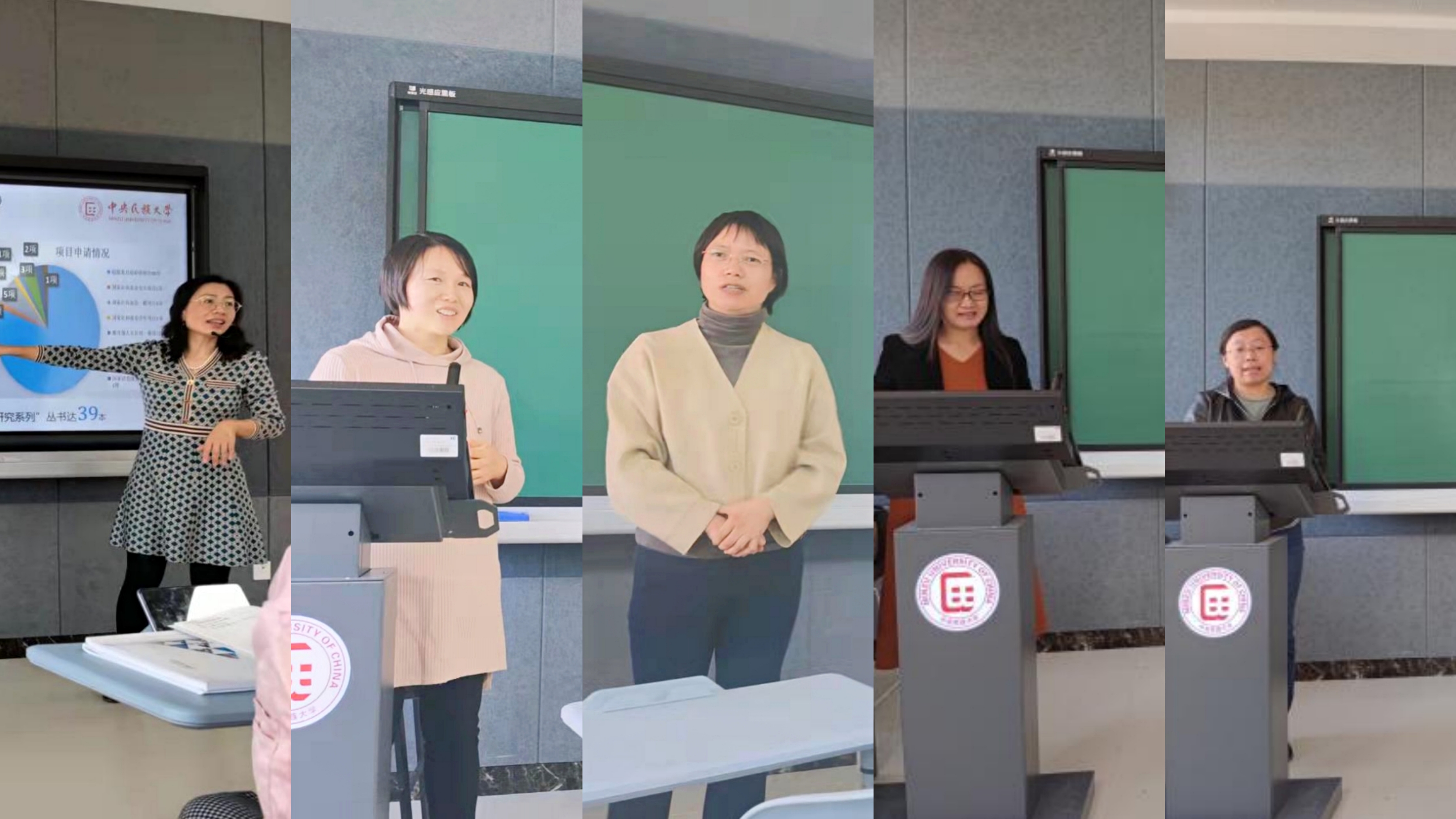 从左到右依次为江傲霜副院长、冯凌宇副教授、曾立英教授、罗莲副教授、孙晓明教授