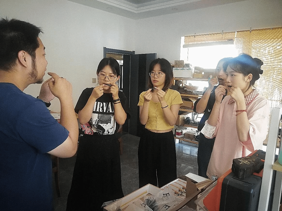 参观完陈列室以后,李旭老师(国家级非遗项目宁夏民间乐器•口弦-宁夏回族自治区级代表性传承人,第十三届全国青联委员,中国民间文艺家协会会员、文化部双创人才扶持计划青年优秀创意人才、中国传统文化促进会理事、中级工艺美术师、宁夏青联委员、银川市青联常委,是非遗民间乐器领域极少有的复合型传承人)为团队成员分别展示了竹口弦与铁口弦的演奏方式,并指导成员体验弹奏由他本人手工制作的铁口弦。李老师耐心且详细地向大家介绍口弦的弹奏方式:根据口腔内舌头位置的变换与喉部的结合,来控制口弦的音高;根据呼吸的变换,来控制口弦的音色;根据手指波动的方式,来控制口弦的节奏。基于这样的方法,口弦不仅可以演奏古老的口口相传的口弦曲,还可以弹奏出许多脍炙人口的民间歌曲与流行歌曲。