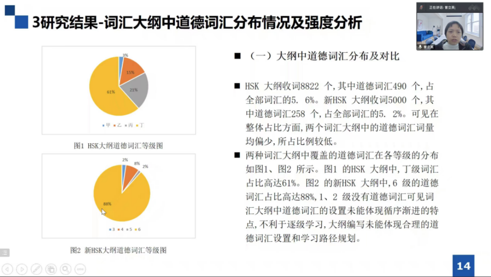 随后,曾立英教授就其最新发表的《国际中文词汇大纲和教材中的道德词汇研究》一文,深入展开论述,对汉语教材(北大版《汉语教程》)中道德词汇的分布及对比、出现强度及与词汇大纲的匹配考量依次做了详细说明。 曾老师的研究是基于数据库进行的统计分析和评估,为黑丝a片
