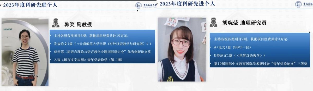 随后,陈院长公布了“2023年度学院科研先进个人”。韩笑副教授与胡琬莹助理研究员获此殊荣。本次表彰既是对两位老师2023年学术工作的肯定,也是对学院全体师生的鼓励。希望师生在下一阶段的科研工作继续努力,提高科研水平,再创佳绩,为学院和学科的发展贡献更大力量。