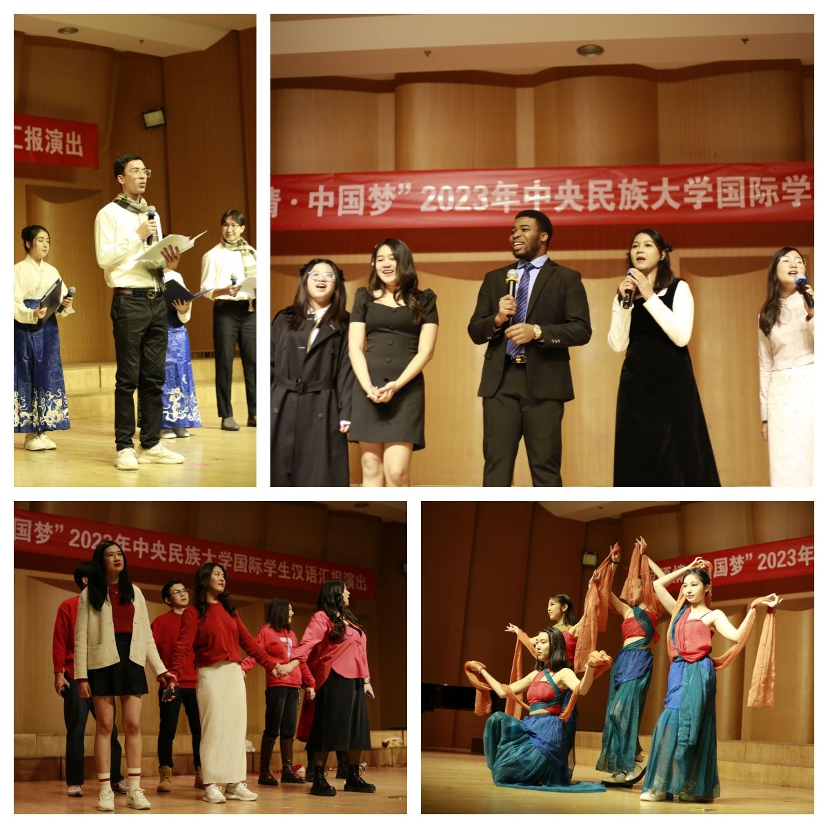 初级组学生尽管学习汉语只有三个月,但他们在舞台上流利地使用汉语进行舞台剧和短剧的表演,博得了台下观众的阵阵掌声和欢呼声。高级组的学生发挥其语言优势,用诙谐的台词和生动有趣的表演,或重新演绎中外经典故事,或真实地再现国际学生在民大的学习、生活和社交,引起了在场观众的强烈共鸣。最后国际硕士和泰国清莱府团结中学短期班的同学为汉语汇报演出献上了动听的歌声和美丽的泰国舞蹈。
