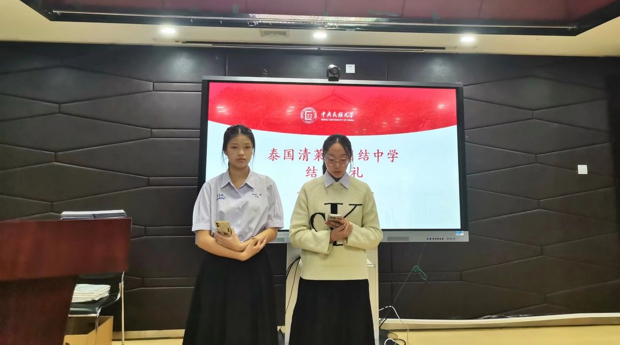 在观看完回顾四周在校生活的视频回顾及学院宣传片后,学生代表张馨月和林丹分享了自己的感悟。她们觉得这次北京之旅非常充实,不仅学院老师的教学严谨、专业,校园环境优美宜人,而且参观游览活动也丰富多彩,令人难忘。她们将永远铭记这段美好的时光,并把在民大学到的知识和技能运用到未来的学习和生活中。