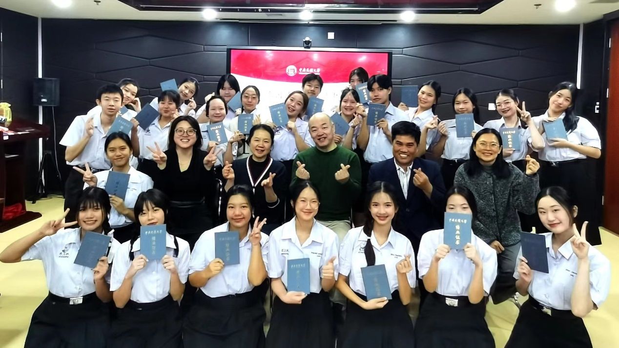 李锷副院长为同学们颁发结业证书,热烈祝贺同学们圆满完成系列中文课程。他高度赞扬了同学们的学习成果和进步,并激励他们在未来的学习和生活中继续努力,进一步提升中文水平。李锷副院长表示,希望同学们为中泰文化交流和友谊的发展做出积极的贡献。最后,他热忱欢迎同学们有机会再次来到黑丝a片