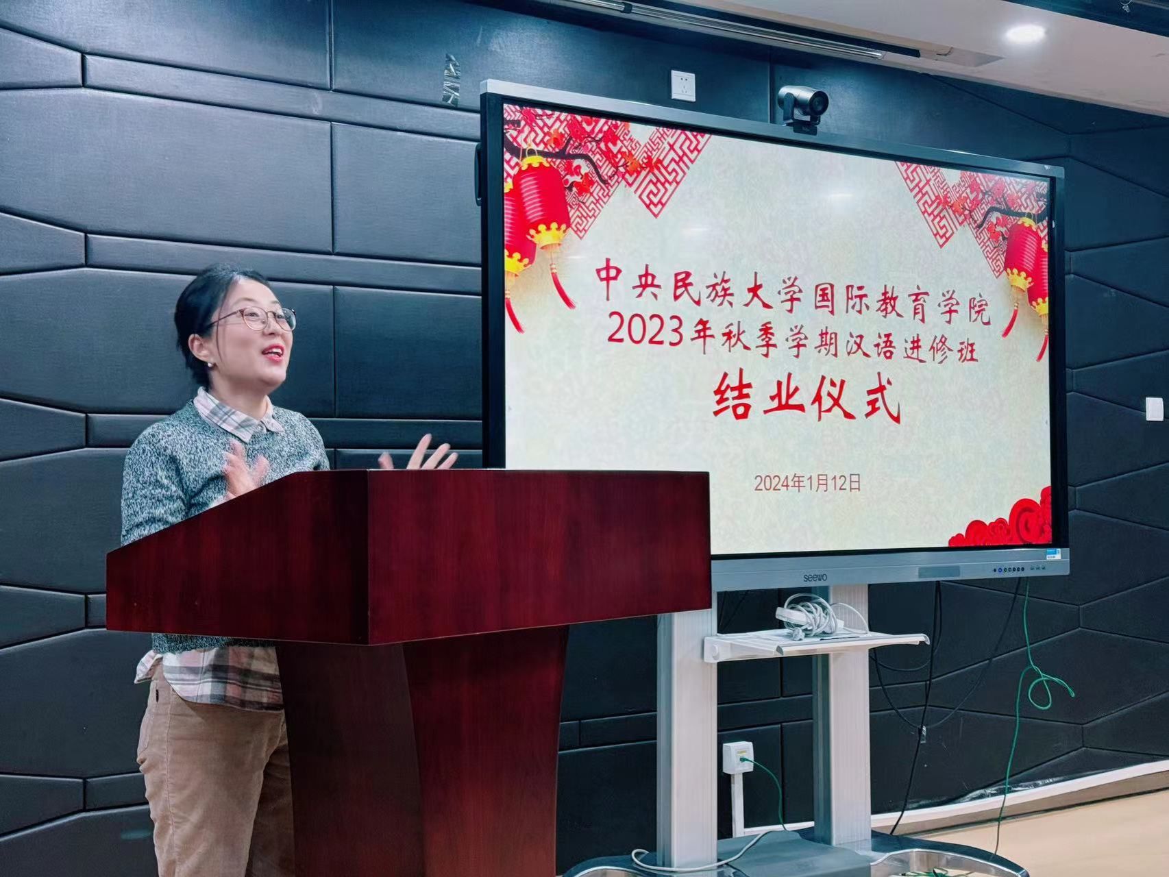 范万莹老师作为教师代表发言,她祝贺同学们取得的成绩,回顾了一学期以来和同学们见证的难忘时刻,希望即将结业的学生继续保持对中文的热爱,有机会再来民大学习。