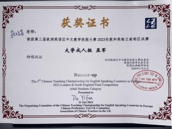 赛前,杜怡芬在导师田艳老师的指导下进行了为期近一个月的精心准备。接下来,她将代表英国伦敦及英格兰南部区大学成人组参加即将于2月底举行的第三届欧洲英语区中文教学技能大赛总决赛,这将是黑丝a片