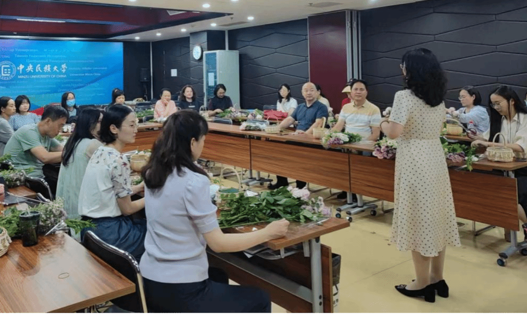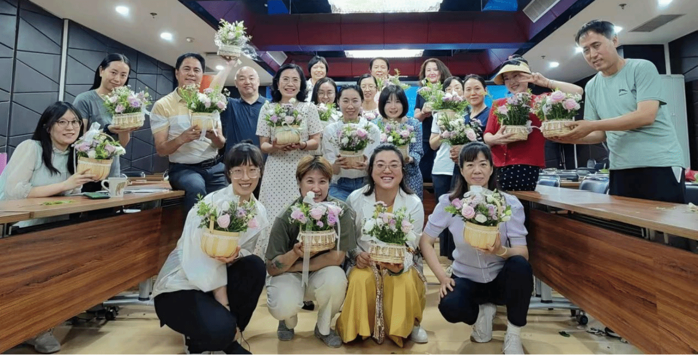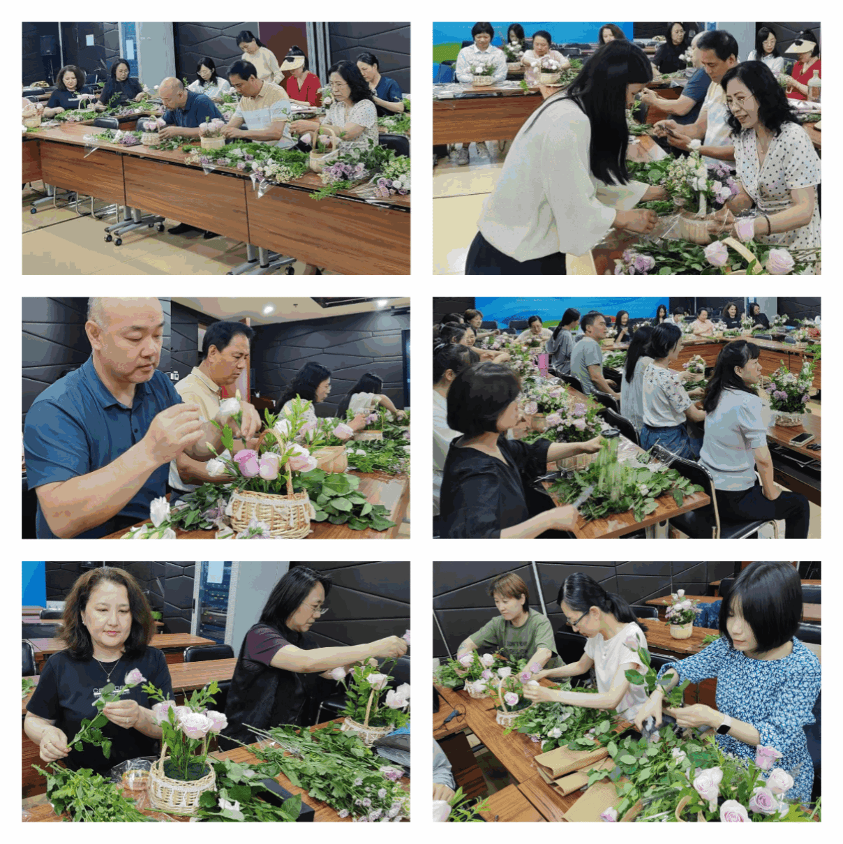 本次活动特邀资深花艺师亲临现场,围绕插花的技巧和要点为教职工们提供专业的演示与指导。在花艺师的带领下,老师们纷纷动手尝试,制作出了精美的花篮。