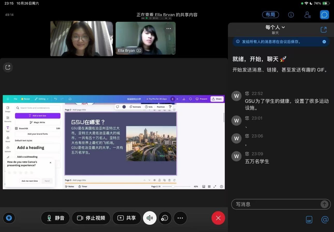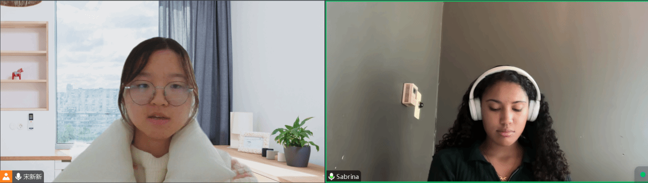 宋新新同学表示:“这是我第二次参与美国Georgia State University的辅导了,这次辅导我结识了Sabrina Mannion。给外国人辅导中文是一场奇妙的文化交流之旅。从基础的拼音发音,再到日常用语的对话练习,看着他们从懵懂到逐渐熟练,眼中闪烁着对新知识的好奇与渴望,我深感自豪,也深切体会到语言作为文化桥梁的魅力。”