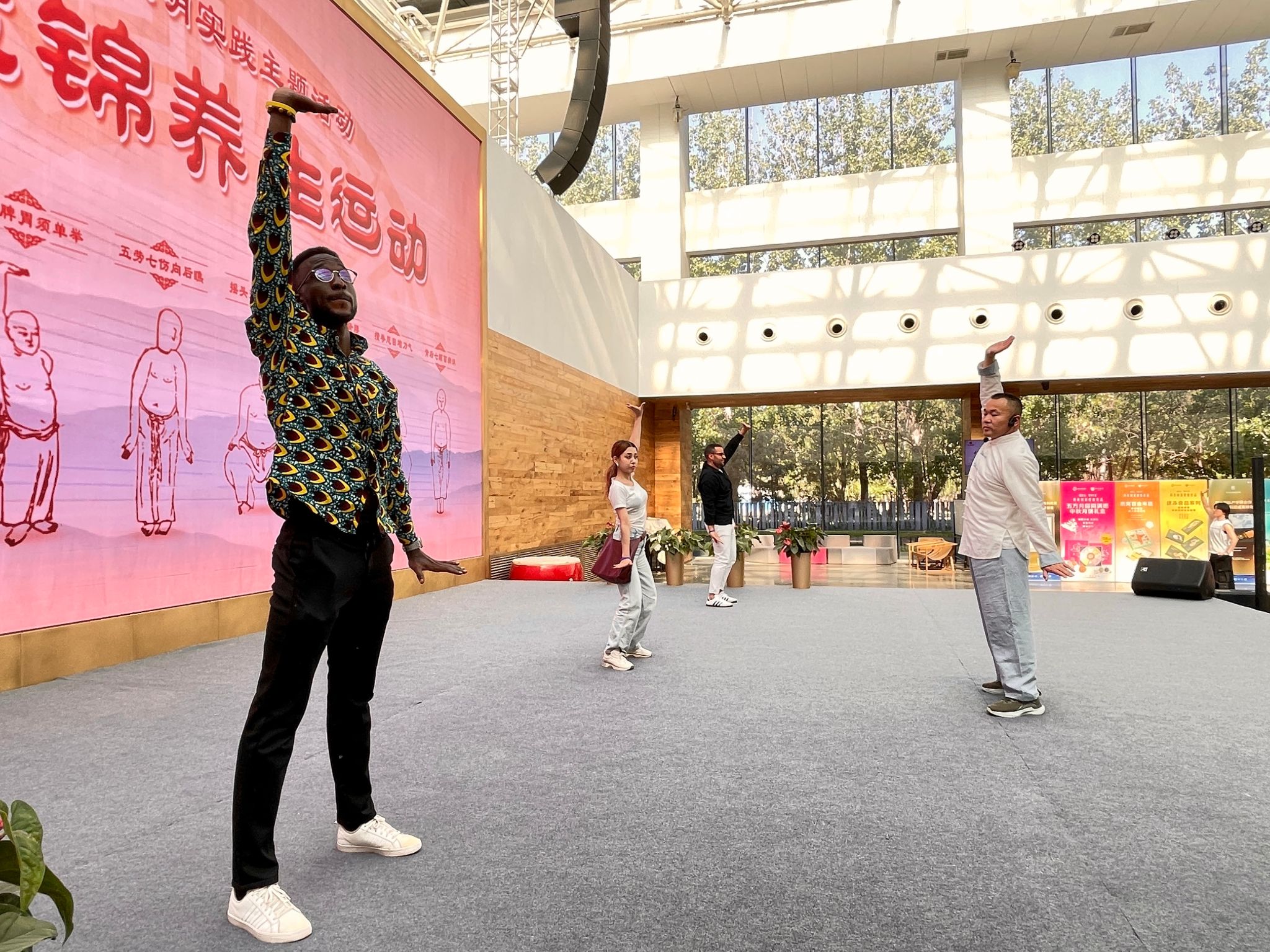 活动最后,学生们在专业教练的指导下学习了中国传统养生功法——八段锦。伴随着舒缓的音乐和教练的引导,大家调整呼吸,模仿动作,体验“调理脾胃须单举”“左右开弓似射雕”等经典招式。中国学生高放兴奋地说:“我第一次接触八段锦,一招一式看似简单,却蕴含着深厚的中医养生智慧。随着呼吸与动作的配合,完成整套功法后,我全身微微发汗,原本的疲惫一扫而空,筋骨舒展,气血仿佛也在一招一式间得到疏通,让我真切感受到传统养生文化的精妙之处,也对中医药文化的博大精深有了更深的理解与由衷的赞叹。”
