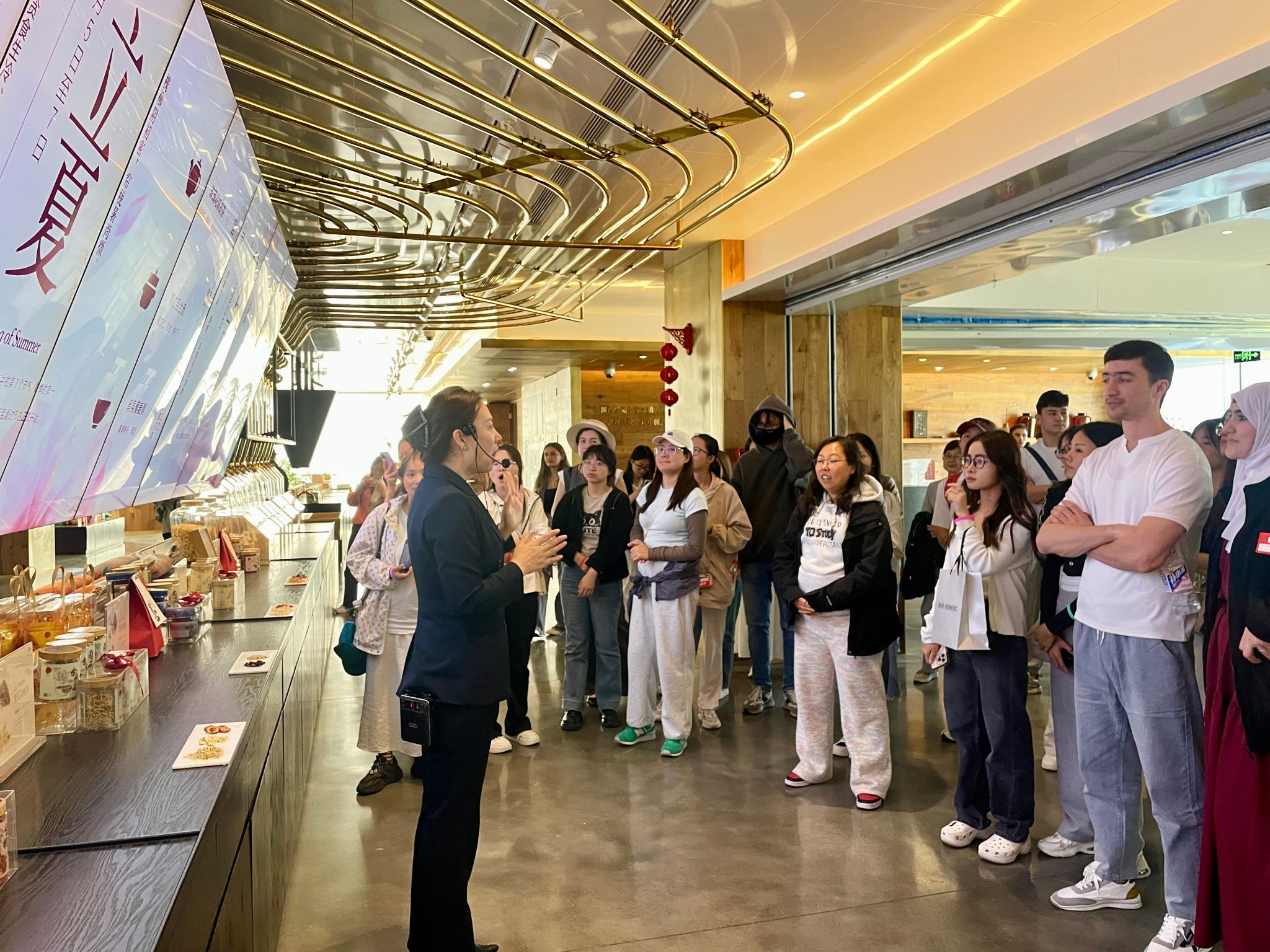 于4月27日组织了一场别开生面的“知行中国”社会实践活动。来自十多个国家的国际学生和中国同学共同走进北京同仁堂知嘛健康零号店,通过参观学习、动手实践和传统健身活动,沉浸式感受中医药文化的博大精深。