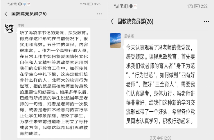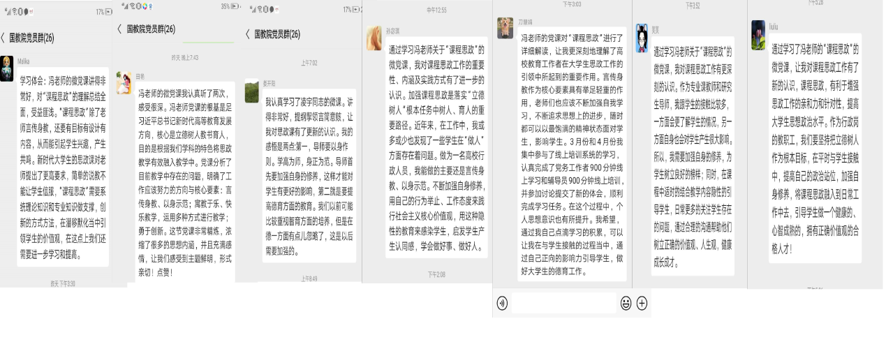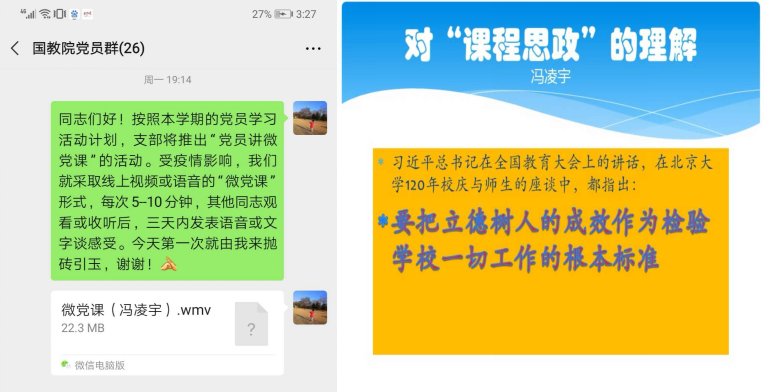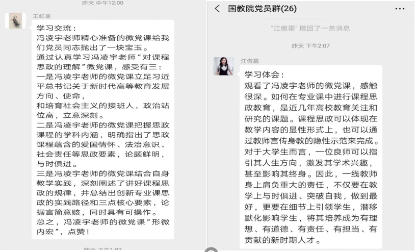5月25日,第一期由冯凌宇同志讲的“对‘课程思政’的理解”微党课在党员群里推出,5分钟的视频微课,该同志结合教学一线的体会,谈了对“课程思政”课重要性、内涵及实践路径的理解。微党课推出后,支部的党员同志们积极观看。包括学院党总支书记周铁海、副书记李锷、委员江傲霜、组织员王红曼等都给予了积极的发言支持,另外也有多位教学和行政岗的党员同志联系自己的工作实际,发言谈论了对高校教师“立德树人”的看法和做法。