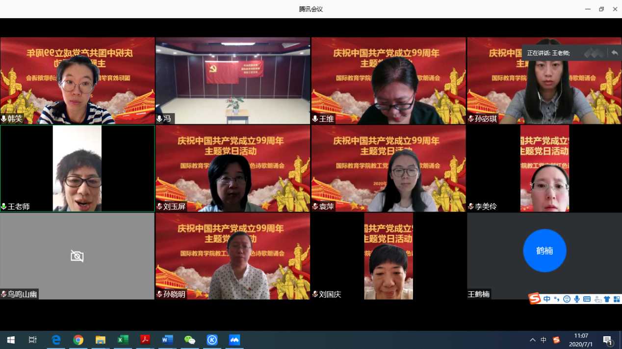 教工党支部在学院党总支的部署和大力支持下,成功举办了庆祝建党99周年主题党日活动,包括总支书记周铁海、副书记李锷和党委委员江傲霜在内的20位党员同志参加了此次活动。活动采取“线上+线下”同一会场的形式,内容主题为“红色诗文朗诵会”,共有11位党员同志进行了精心准备,朗诵了6部经典诗文作品。
