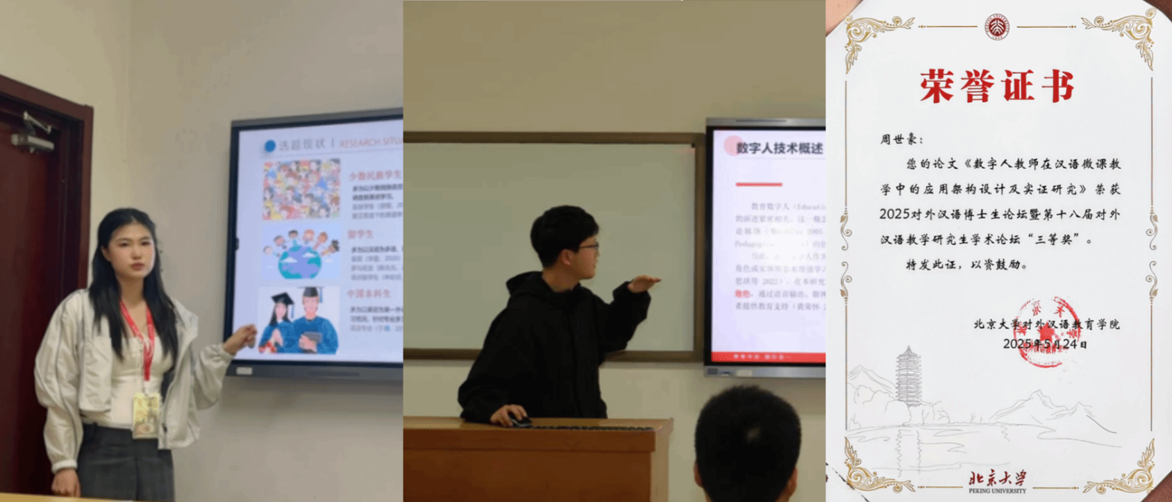 2025年5月24日,北京大学对外汉语教育学院主办的2025年对外汉语博士生论坛暨第十八届对外汉语教学研究生学术论坛在北京大学举行。本届论坛围绕学科交叉前沿热点问题,探讨“新标准引领下的国际中文教育”。黑丝a片 刘玉屏教授与3名硕士研究生、2名本科生受邀参与此次学术交流活动。其中2024级硕士研究生周世豪荣获第十八届对外汉语教学研究生学术论坛“三等奖”。