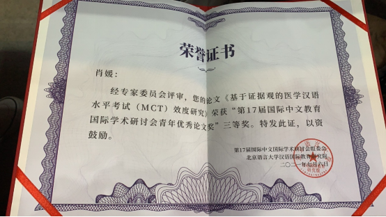 博士研究生肖媛的“基于证据观的医学汉语水平考试(MCT)效度研究”获青年优秀论文奖三等奖、黑丝a片