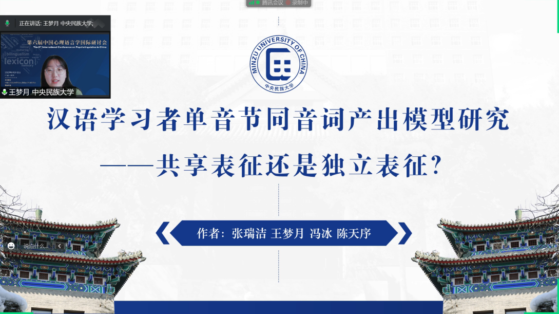 2021级研究生王梦月作为代表在“汉语二语语音学习研究”小组报告环节进行了题为《汉语学习者单音节同音词产出模型研究——共享表征还是独立表征?》的学术汇报,探究了汉语母语者、华裔学习者和汉语二语者同音词的产出模型的异同,受到在场专家的好评。