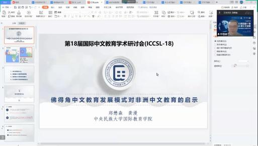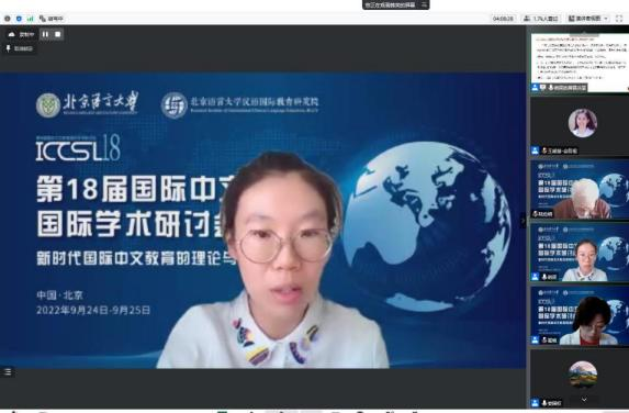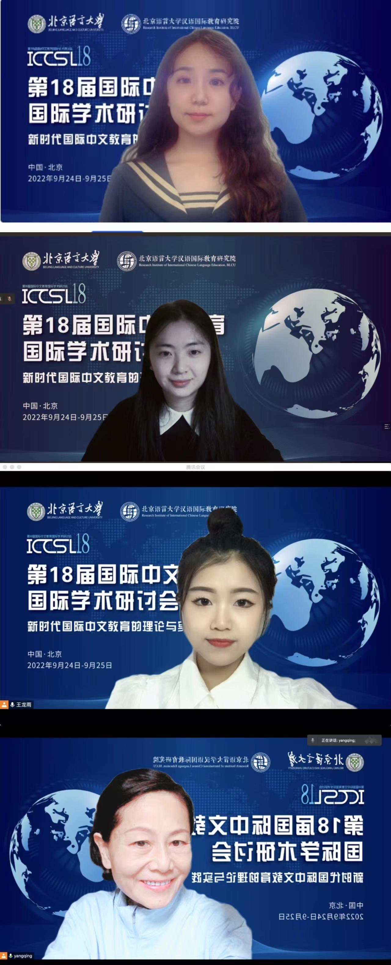 教育技术与教学资源方面,央青副教授主持了教学资源建设与研究分会场并与硕士研究生王龙雨报告了《“中文+”教学资源建设新发展》;博士研究生武晓琴报告的题目为《国际中文线上学习无聊情绪对学习效果的预测作用》;博士研究生王弘睿宣读了题为《港、澳、台国际中文教材价值取向比较研究》的论文;硕士研究生张齐红主持了教学法研究与应用分会场,并汇报了由田艳副教授指导下完成的论文《主题式教学法在微课教学中的应用实践研究》;硕士研究生王艺报告了在刘玉屏教授指导下完成的研究《在会上汉语教学“线上翻转课堂”的实施条件和教学设计—以语法教学为例》。