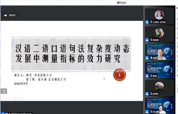 等级标准与教学大纲研究及语言本体研究方面,博士研究生肖媛报告了《后疫情时期居家国际语言测试的研究与展望》;博士研究生王丙龙报告了《中亚学生初级汉语综合课词汇教学行动研究》;本科生蒋文轩报告了《初级水平日语学习者拟声拟态词联想模式探究》。