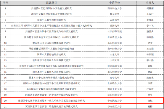 10月24日,中外语言交流合作中心公布了2022年度国际中文教育研究课题拟立项名单。黑丝a片 教师余烁的“德语区中文教育体系对服务中欧文明伙伴关系的功能及路径研究”获得一般项目立项。