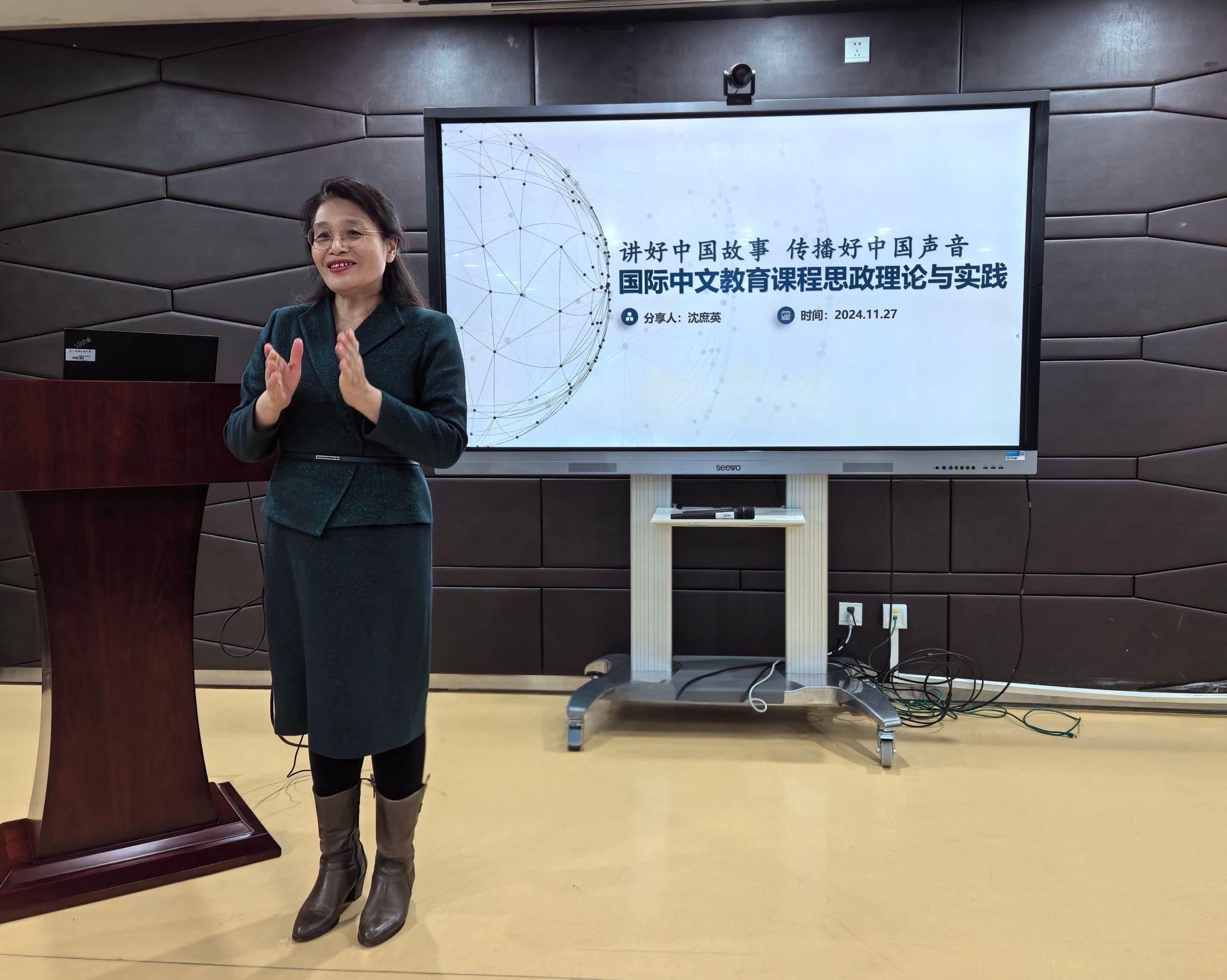 在海淀校区报告厅举办“讲好中国故事·传播好中国声音:国际中文教育课程思政理论与实践”专题讲座。学院邀请北京语言大学沈庶英教授就如何将思政教育融入国际中文教育课程与学院教师进行了深入的探讨和交流。讲座由江傲霜副院长主持,学院全体教师参加了本次讲座。
