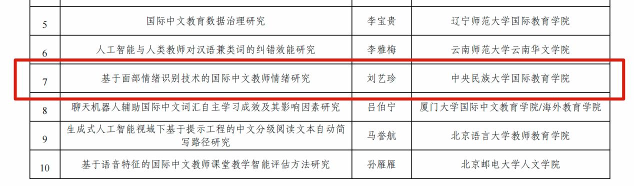 2024级博士研究生刘艺珍的课题《基于面部情绪识别技术的国际中文教师情绪研究》喜获立项。该课题在陈天序教授的指导下,通过运用面部情绪识别技术,深入探讨数字人教师与真人教师在面部情绪表达方面的差异,旨在为国际中文教育教学领域提供全新的技术指标和评价成果。